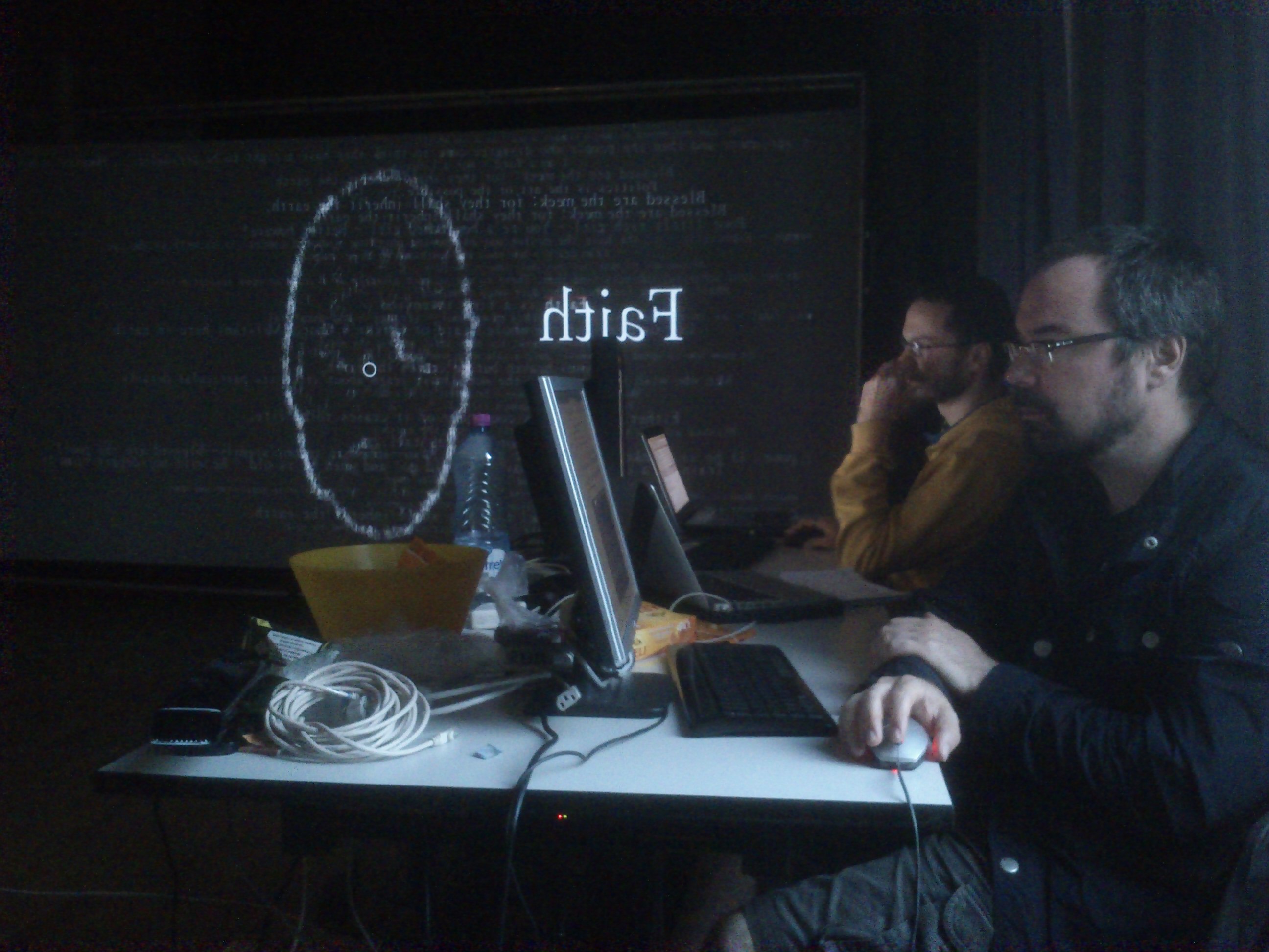 The Venice Mostra is suddenly far away… Marc of Minds Meet (my producer) is actively preparing the Belgian premiere of Welcome Home (finally the new website !) at the Ghent Film Festival coming October. In the meantime I’m working this week with my French colleagues Nicolas and Jack on my media installation DarkMatr-v2. Yes, they are very concentrated when they code in Pure Data 😉